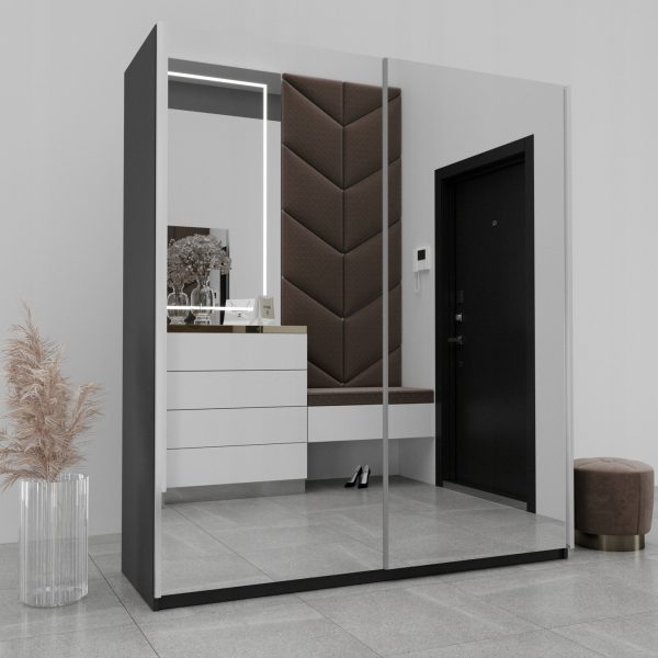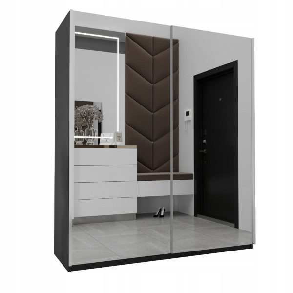 - Lustro – to najpopularniejsze rozwiązanie jakie jest wybierane przez klientów w modelu ELBA 3. Lustra naklejone są w całości na dwóch frontach, dzięki takiemu rozwiązaniu optycznie powiększysz i rozświetlisz wnętrze…