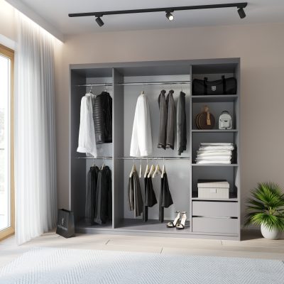 • 18 mm –  dzięki temu, że płyta laminowana ma 18 mm grubości (grubsza niż u innych producentów), szafa po zmontowaniu jest stabilniejsza , bardziej wytrzymała i będzie służyć na lata. Szafa wykonana z grubszej płyty, wizualnie prezentuje się o wiele lepiej w pomieszczeniu. Co najważniejsze, szafa poradzi sobie z każdym ciężarem ubrań. Bluzki, sukienki, kurtki i płaszcze – z pewnością idealnie wpasują się w rozmiar szafy, a ich ciężar nie wpłynie na jej stabilność.