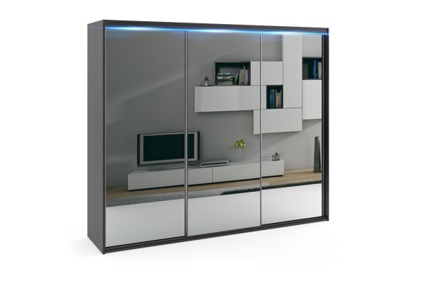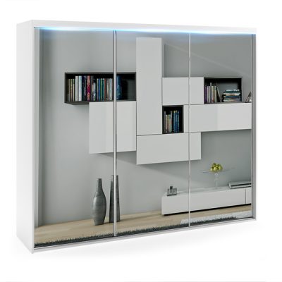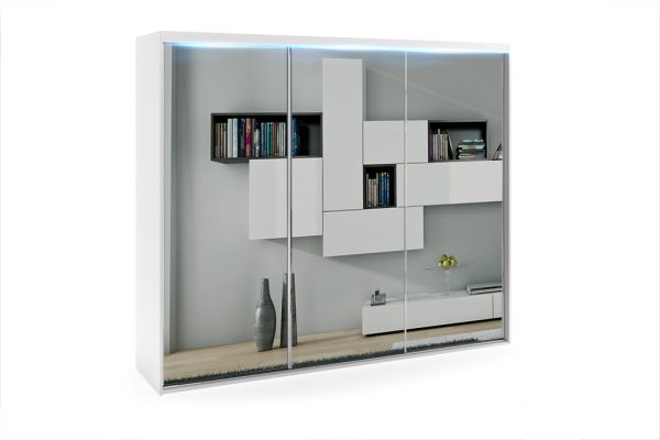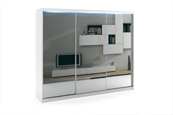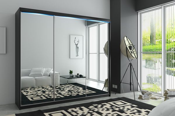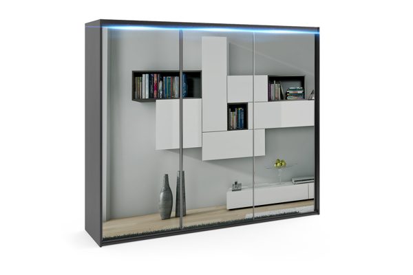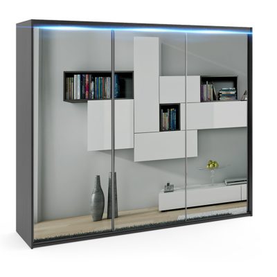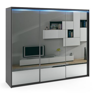 - Lustro – to najpopularniejsze rozwiązanie jakie jest wybierane przez klientów w modelu PORTO 6, lustra naklejone są w całości na wszystkich trzech frontach, dzięki takiemu rozwiązaniu optycznie powiększysz i rozświetlisz wnętrze.